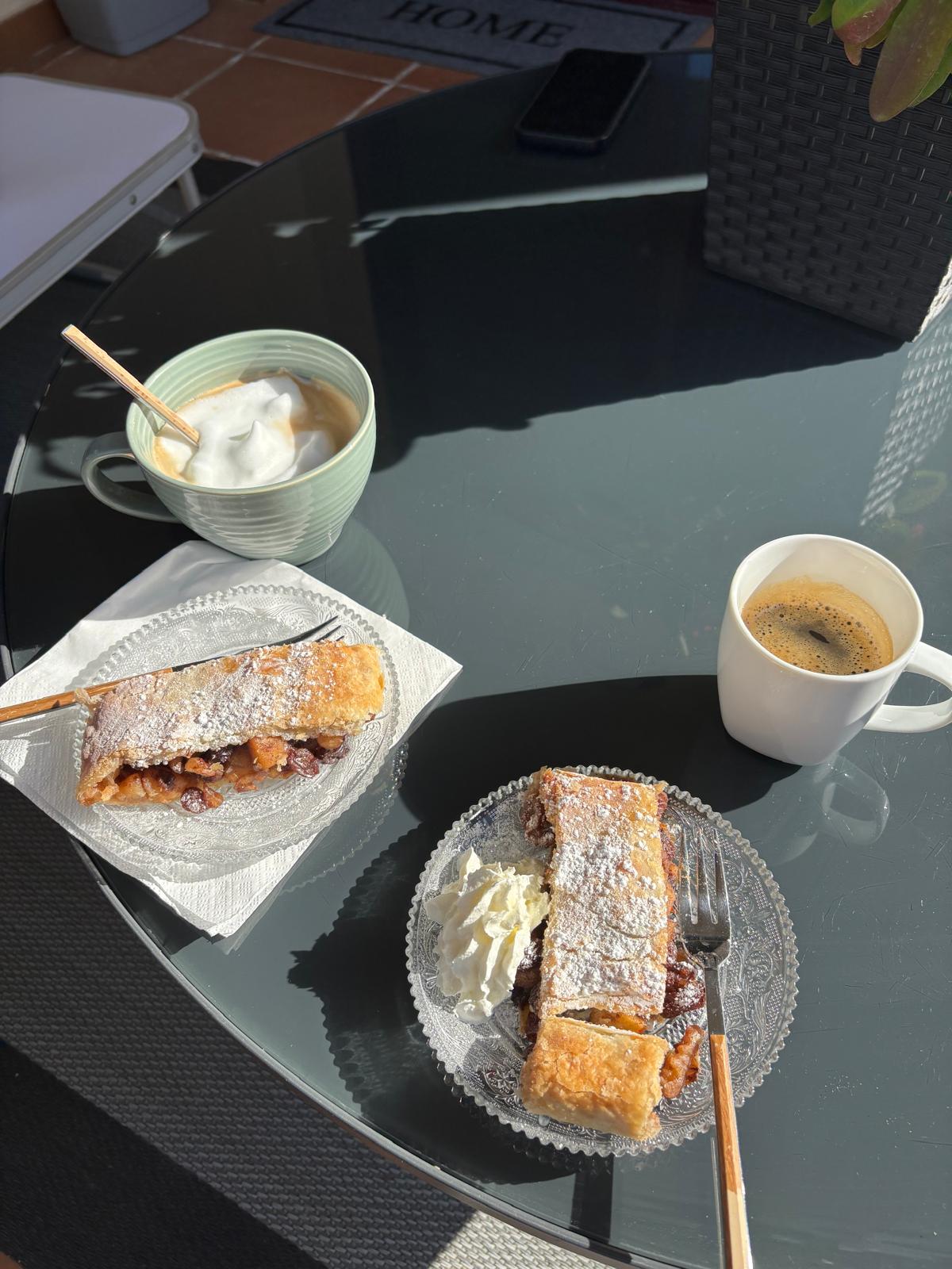 Dan komen onze engelse buurtjes aan. Altijd weer gezellig elkaar terug te zien. Daar heb ik Apfelstrudel voor gemaakt. Ook nodigen wij Cees uit, hij houdt van mijn appeltaart.
