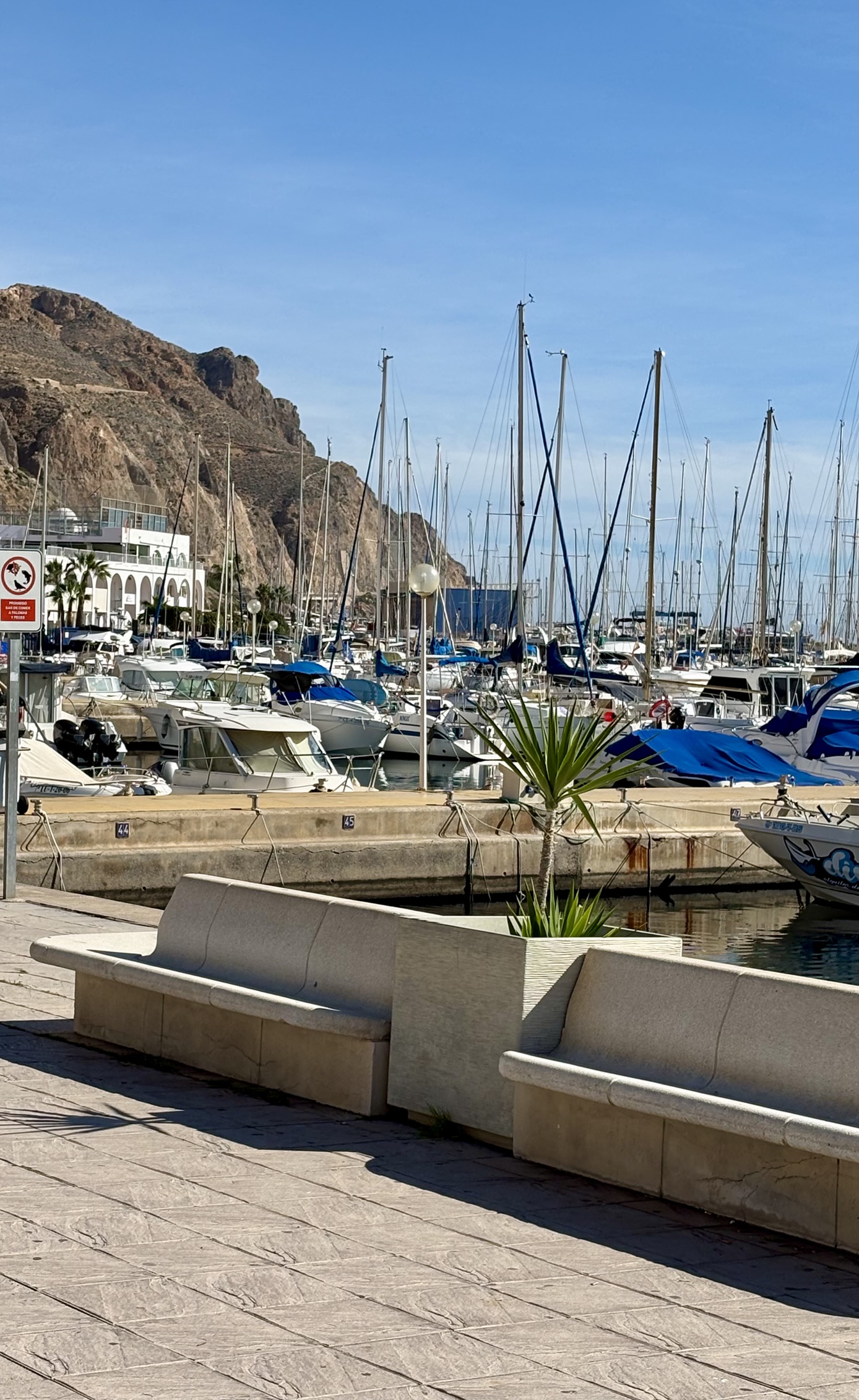 Vanwege de bacterie in het water in Los Alcázares besluiten wij richting het zuiden te gaan en daar ergens te overnachten.Wij beklimmen de rots bij Mazarron. Daarna uitrusten op een bankje voor de Bolnuevo.
